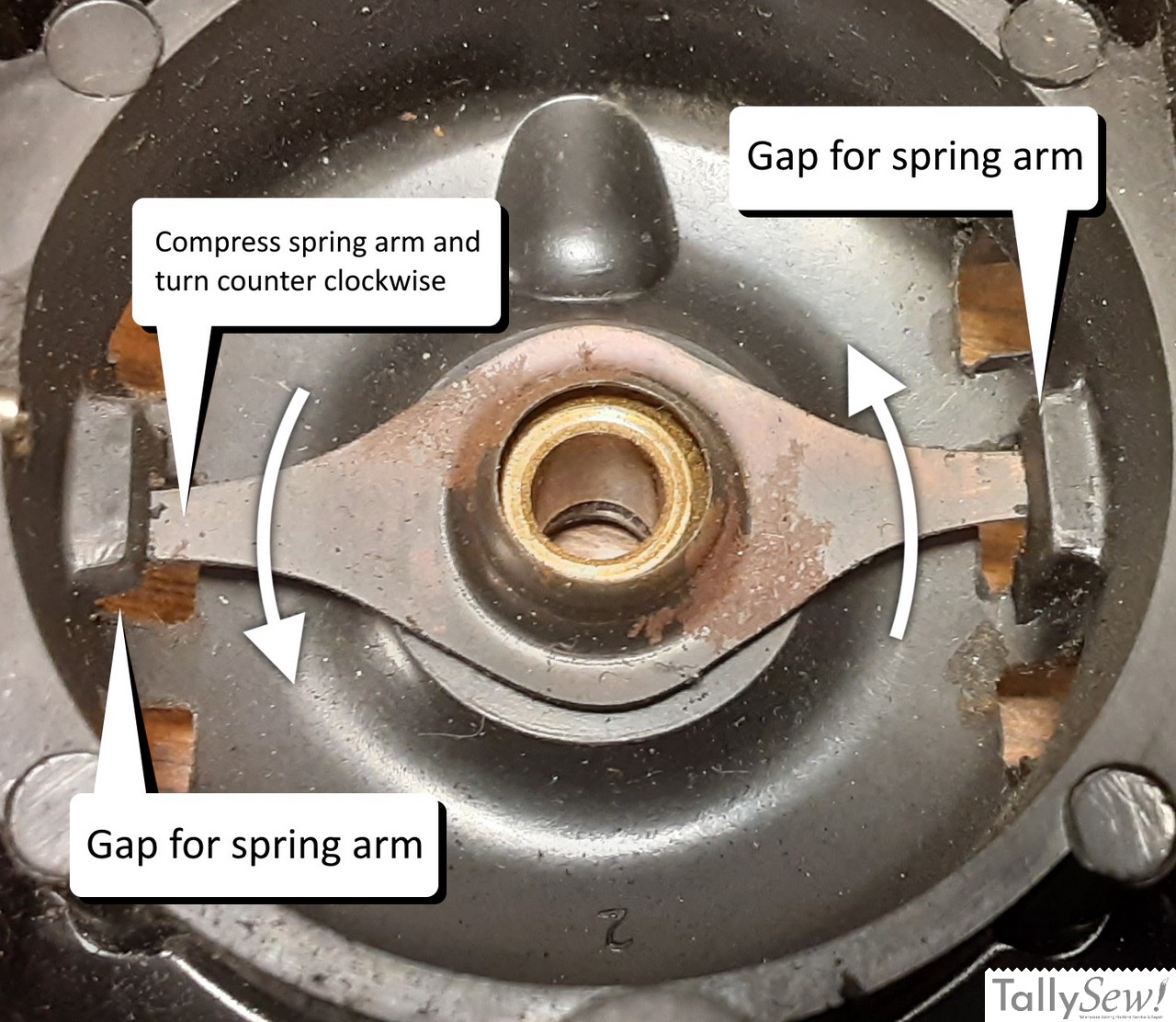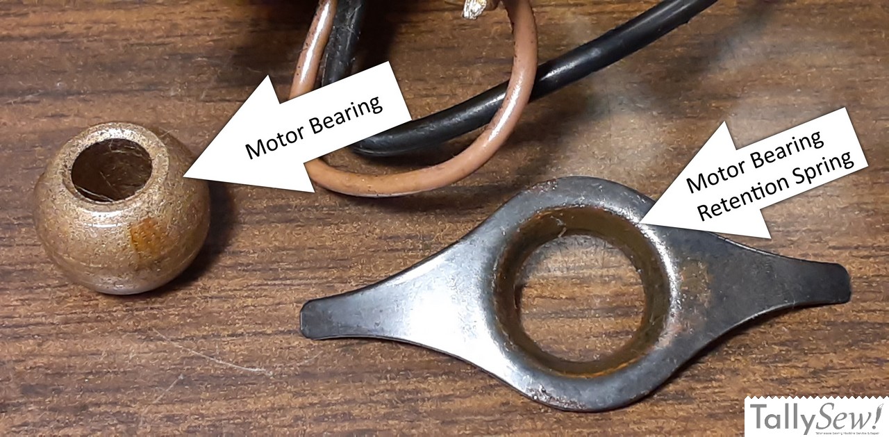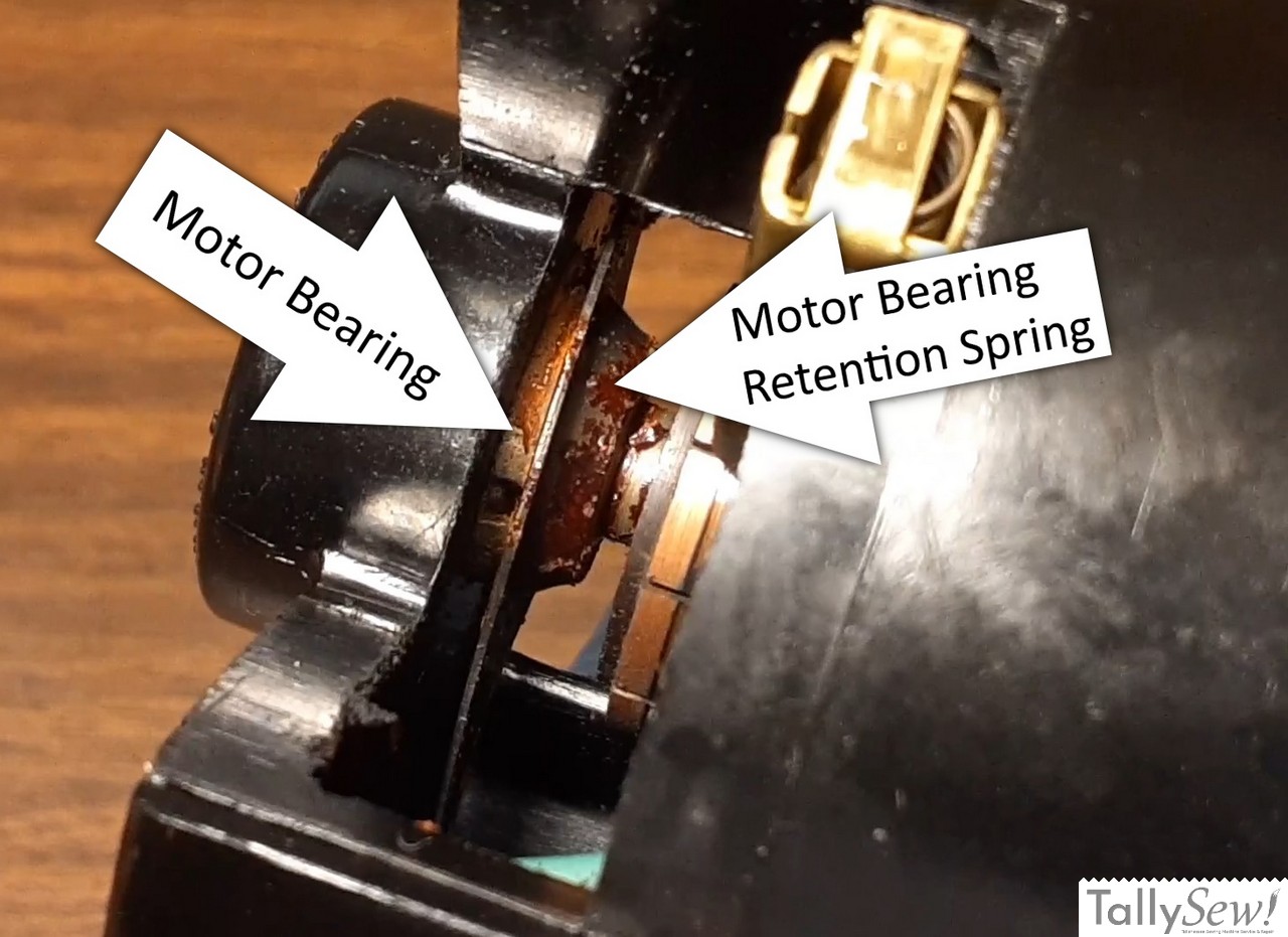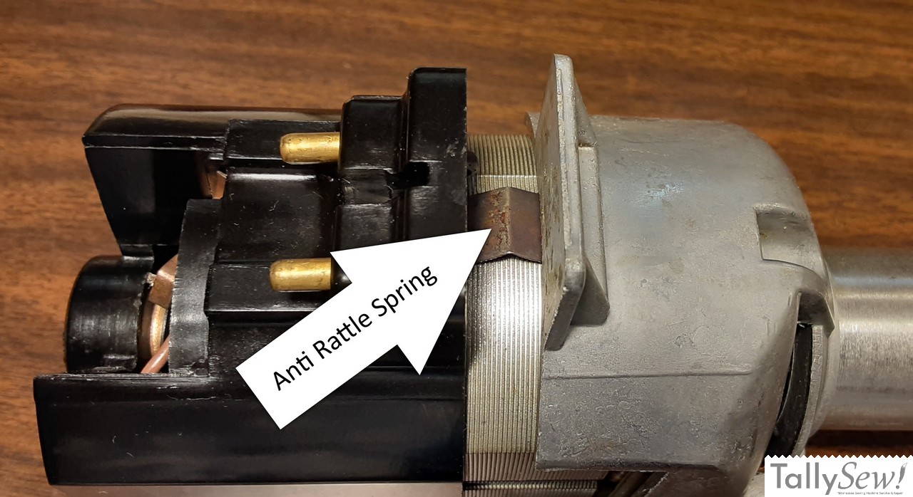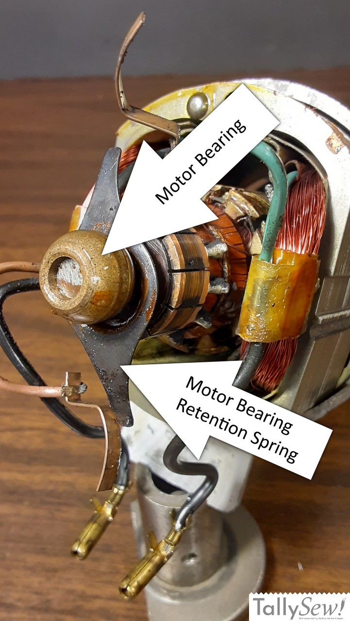 Note: The image above is from a Singer 306K Swing Needle BA3-8 Motor. It’s not the same motor, but the motor bearing retention spring works the same way as it does in the Singer PA9-8 motor. Also note, unlike the BA3-8 motor, the PA9-8 motor does not use any grease wicks to retain lubrication.
