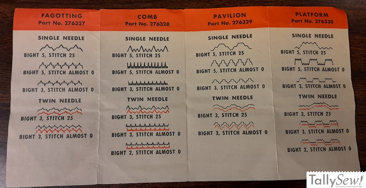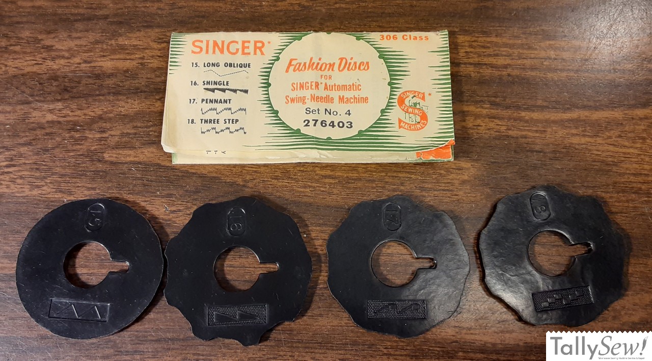 Introduced in the 1950s, the Singer 306 Class Fashion Discs, also referred to as Singer flat cams, and Singer “A” cams, were interchangeable stitch pattern cams that allowed the Singer 306 series machines to make decorative stitches.