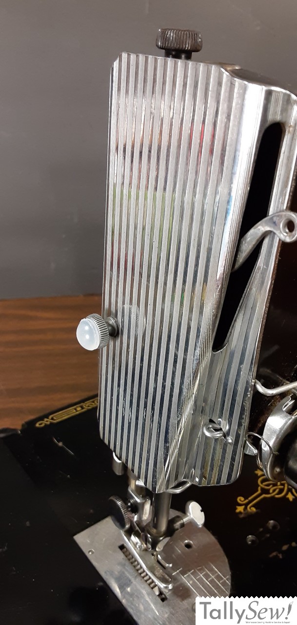 You can buy 3/8 inch self adhesive cabinet bumpers at the hardware store. Simply stick one to the front plate thumb screw to help protect your bed extension on your Singer 221 Featherweight. If you don’t happen to have 16 Featherweights, you can share the extra bumpers with your friends.