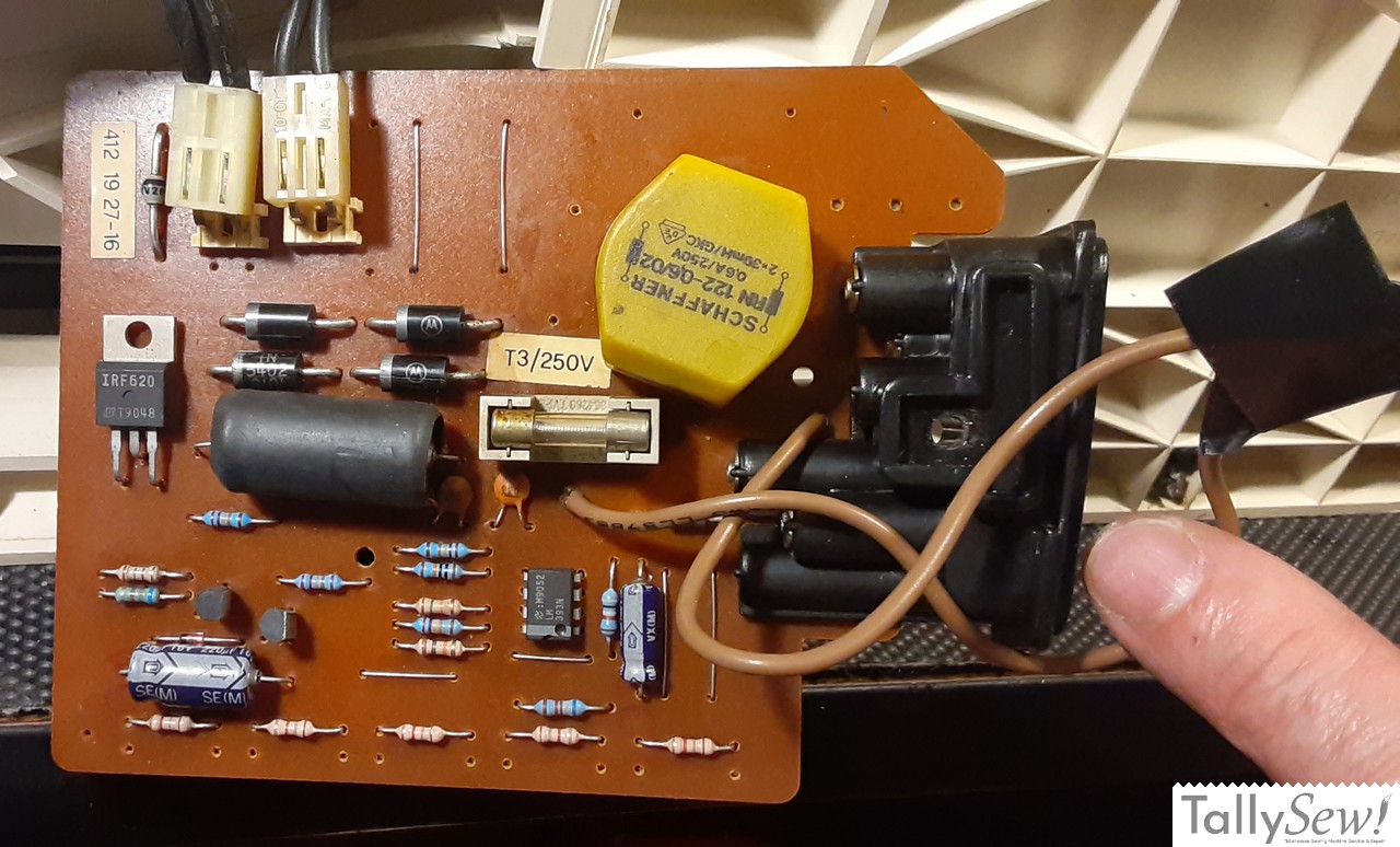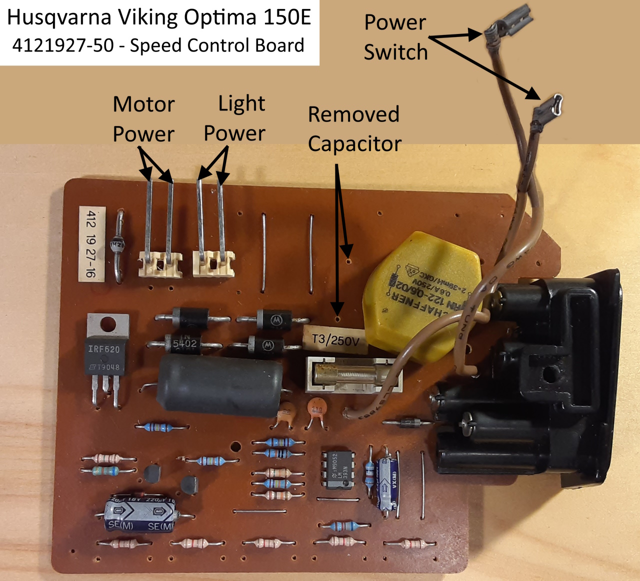 This Husqvarna Viking Optima 150E was given to me by a friend in Gainesville Florida who wanted to find an easy way to get these “Electronic” machines up and running. We started out with three machines, each one indicating some failure in the speed control board. Since these machines are more than 30 years old and have already suffered a failure, it was decided that eliminating the speed control board and using a traditional foot control unit was the solution that made the most sense.