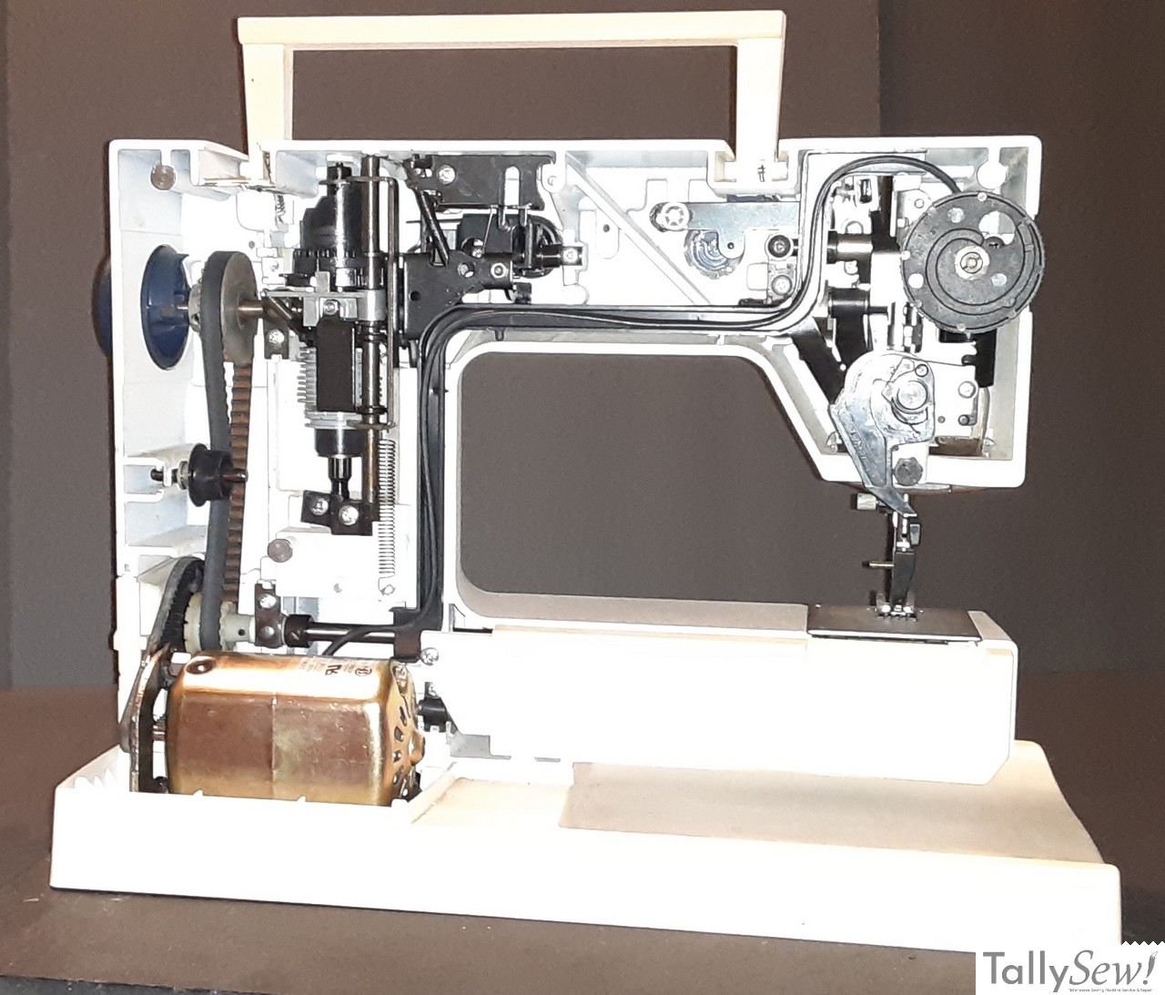 Unlike even the new sewing machines, this machine has no metal sub frame. Unsurprisingly it also has a plastic stich pattern cam stack.