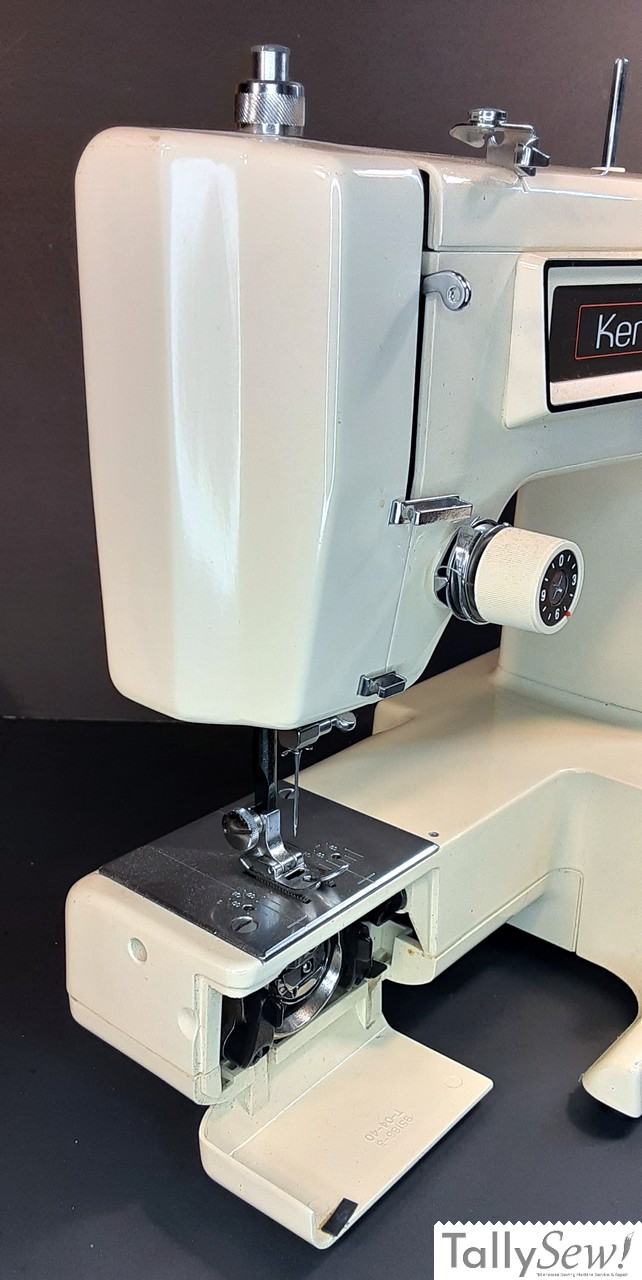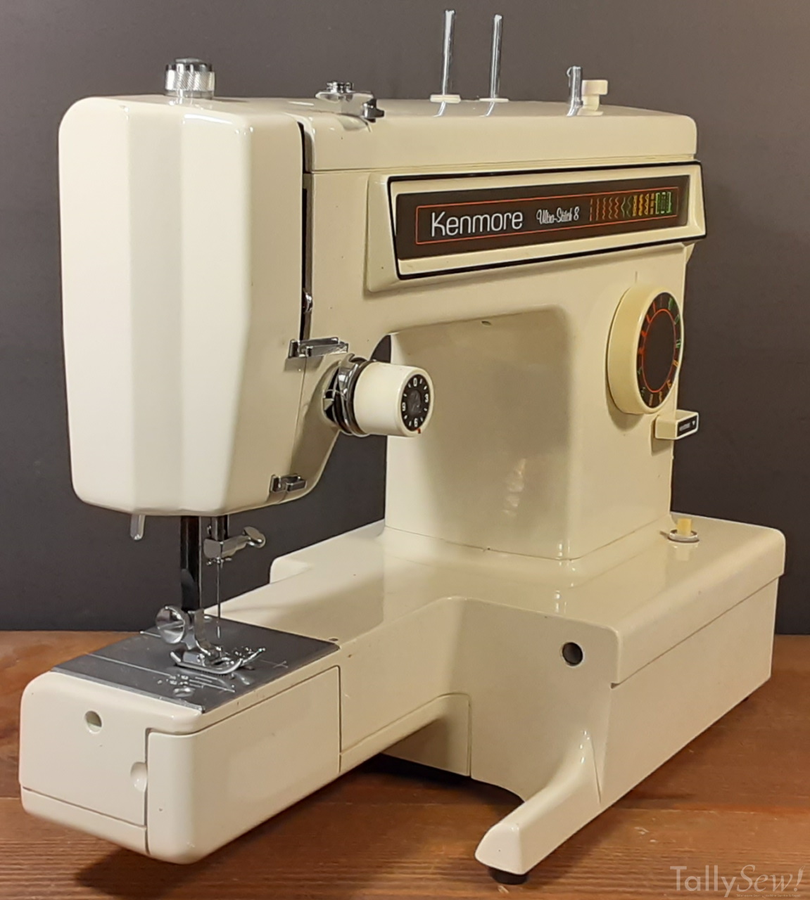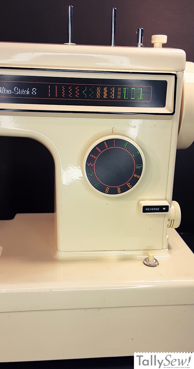 Introduced in 1981, manufactured in Taiwan for Kenmore by Jaguar/Maruzen. As you can tell from the name this machine came with 8 internal stitches. This machine does have a plastic cam stack and some of the drive train contains plastic parts.