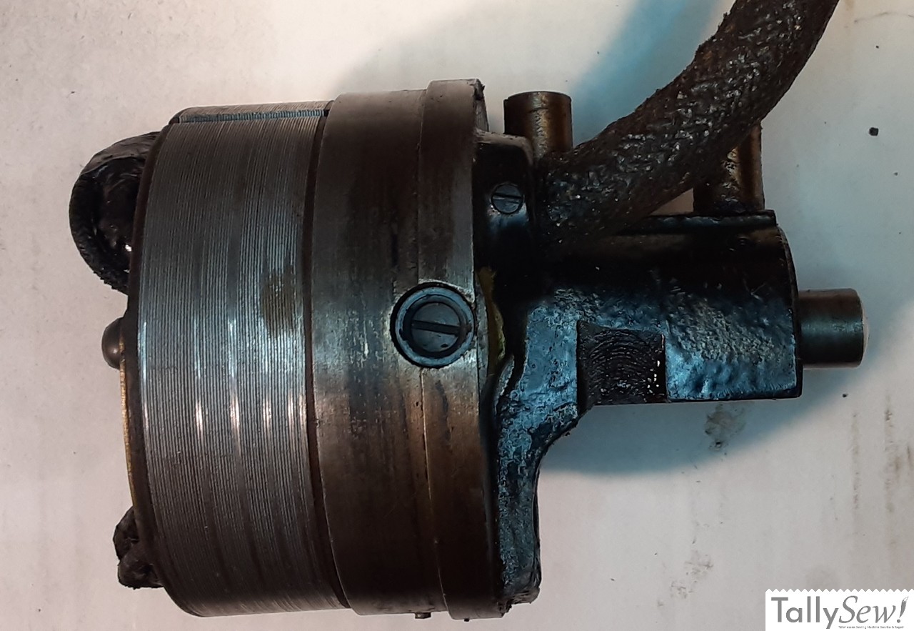The Singer 101 was the first household Singer sewing machine to use the fully gear driven and enclosed potted motor design that did away with the external belts used on most other machines of the day. The tern “Potted Motor” refers to the pot shaped cover that sticks out the back of the machine. The potted motor on the 101 is unique to the model, unlike the potted motors found on the later machines that are (usually) similar enough that they will work on other models. For example, the motor found on a Singer 201-2 will work on a Singer 15-91, with the bobbin winder assembly being the only real difference.