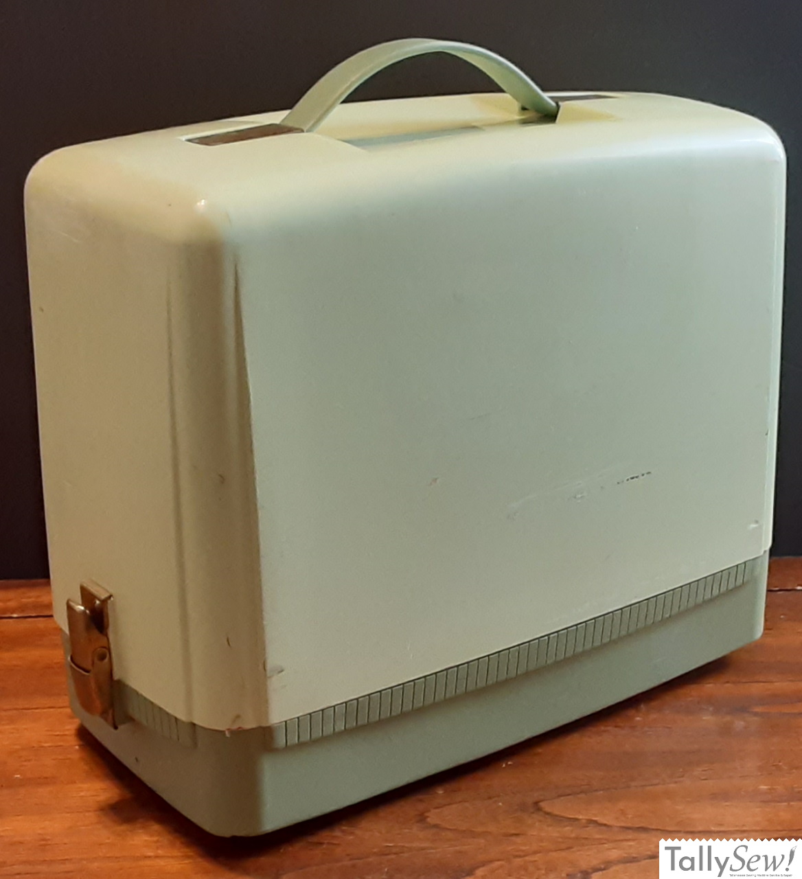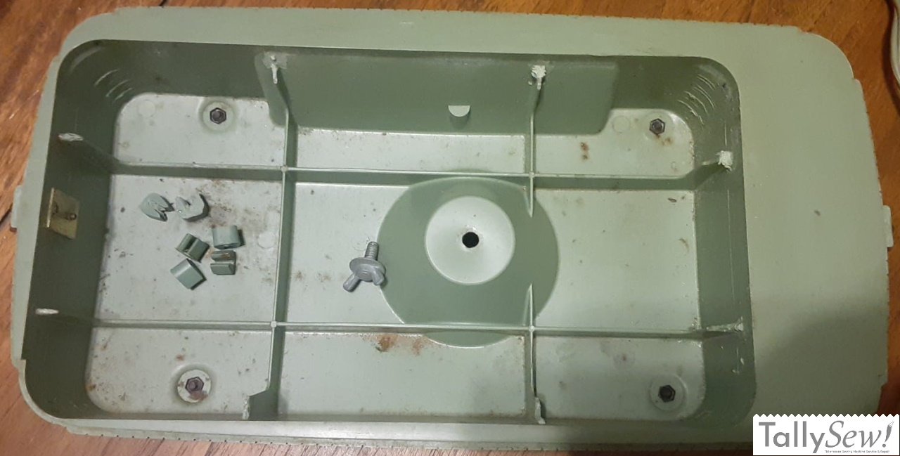 Some of the Singer 185 machines came in a cabinet and some in a plastic carry case. Above is the carry case for my 185J. These cases are really cute, but they tend to be very fragile after 60+ years of use and exposure to UV light and the environment. The first thing to go is the little ribs that support the machine in the base (see photo above). It’s a good idea to just keep the case as a decoration without the machine in it since the weight of the machine itself does damage to the case bottom.