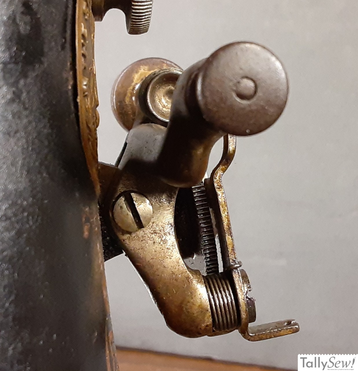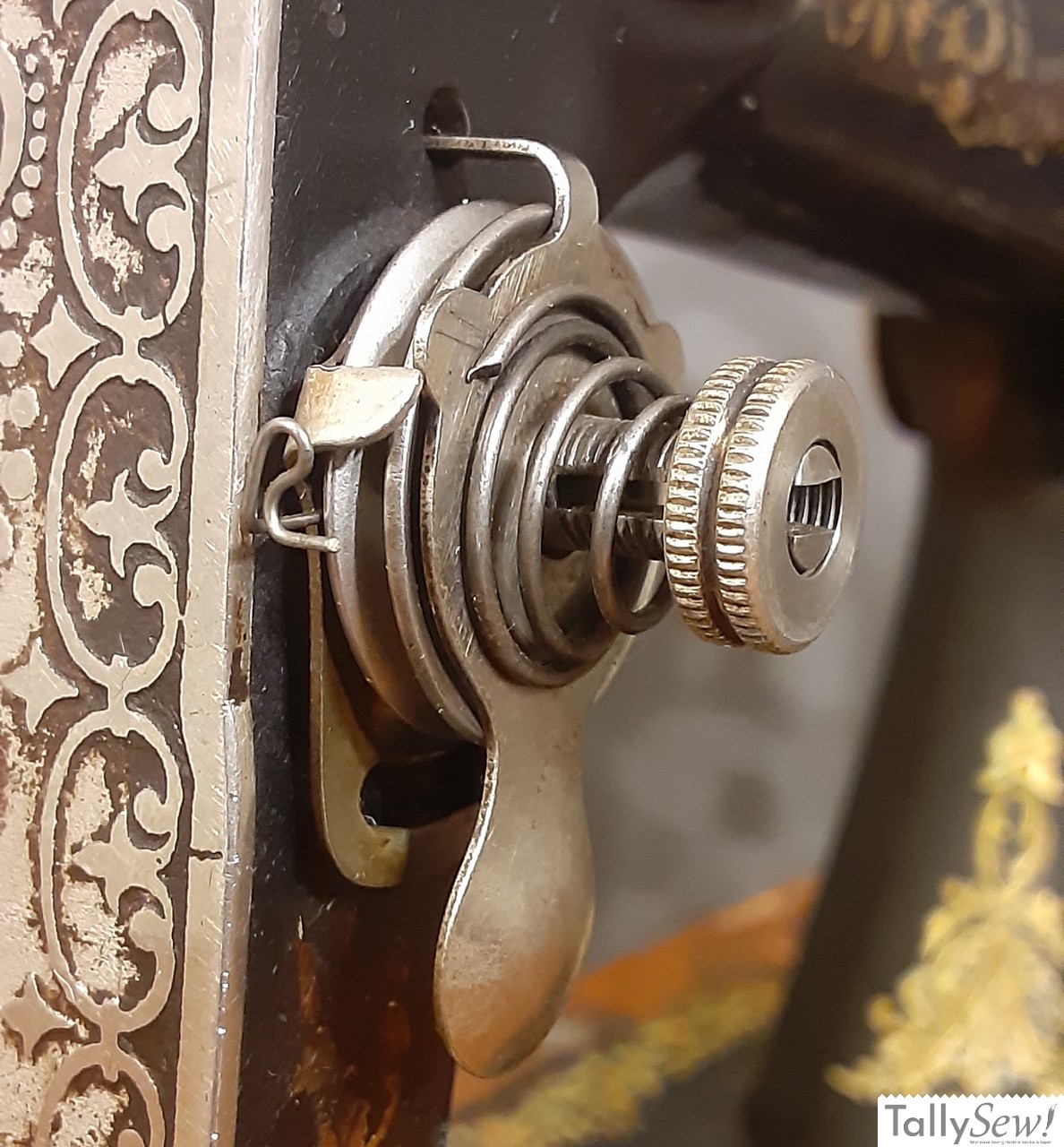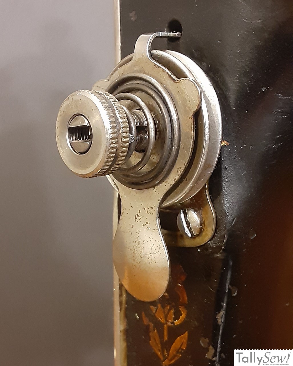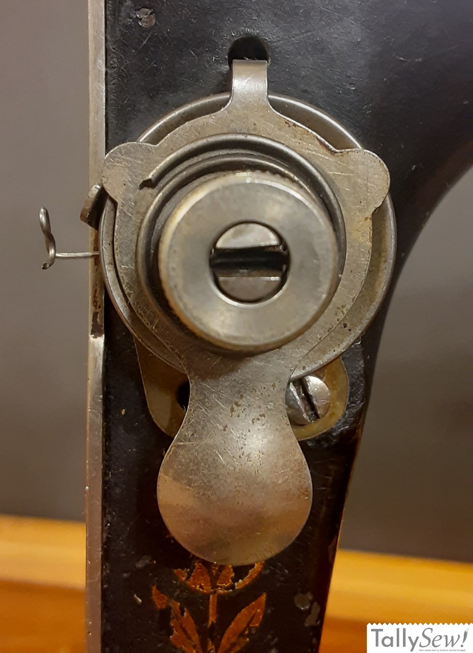 The tensioner on the Singer 27 does not have a tension release pin as found on more modern machines. Instead it has a tension release spoon that you pull out on to compress the tensioner spring, releasing the tension placed on the tension discs.