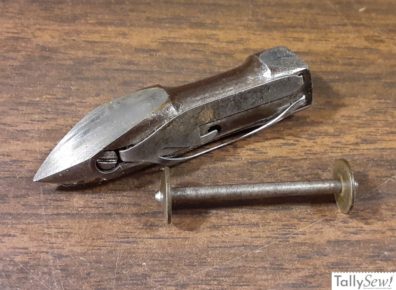 The shuttle in the Model 27 moves rapidly forward back to front from the users perspective, or “vibrates”, in an arc along a track inside the machine bed beneath the front and back throat plates. The shuttle is a boat-shaped metal bobbin case that holds the long, cylindrical bobbin. The he bobbin case with the bobbin contained within vibrates horizontally beneath the needle plate and front and back throat plates.