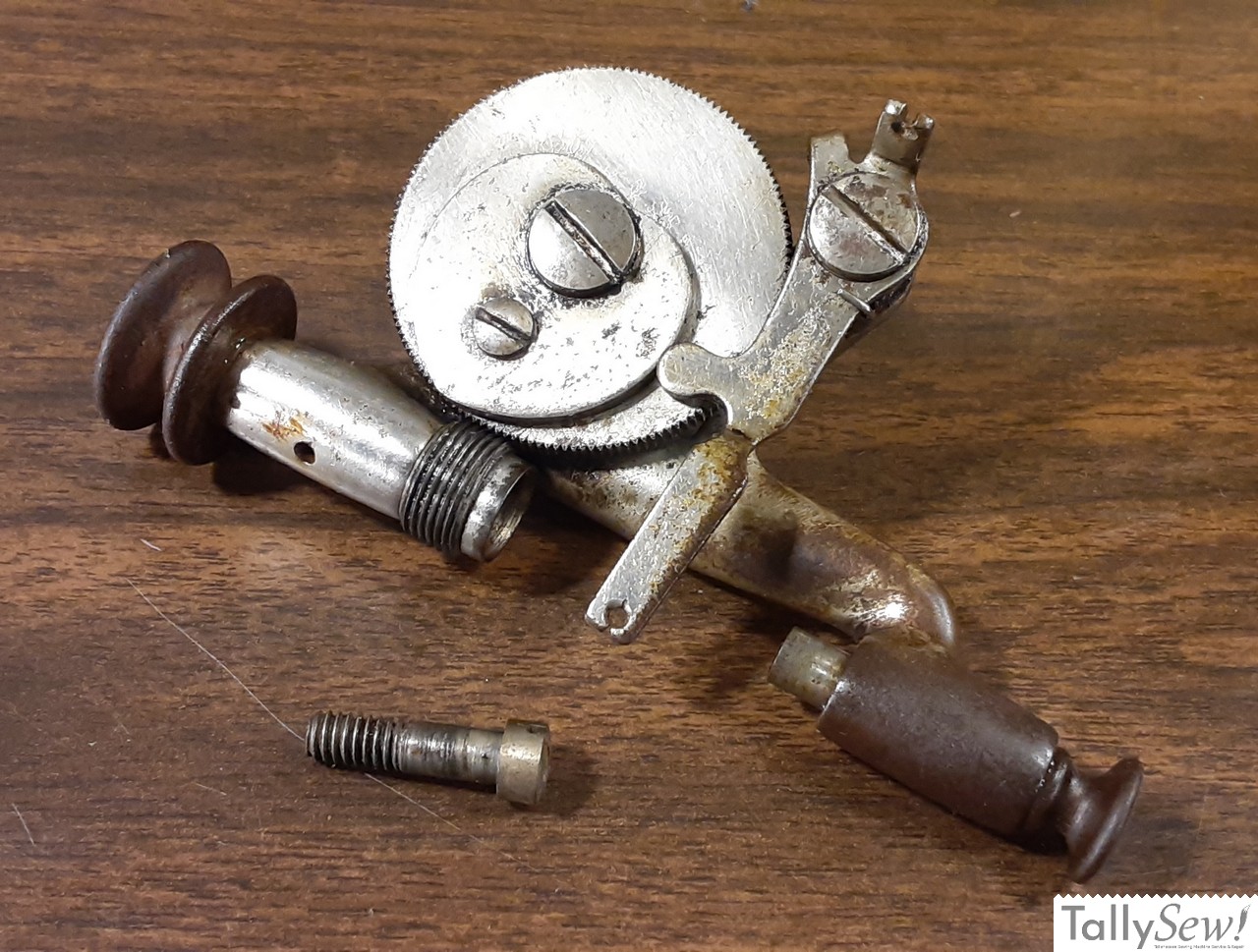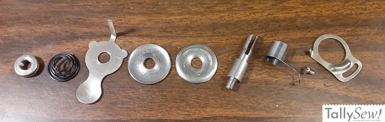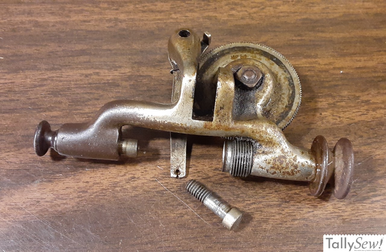 The bobbin winder on the model 27 is a beautiful if not overcomplicated piece of engineering. This bobbin winder uses the treadle belt to drive the bobbin winder, and the heart shaped cam in the middle of the drive gear swings the feed arm back and forth to evenly distribute the thread on the long bobbin.
