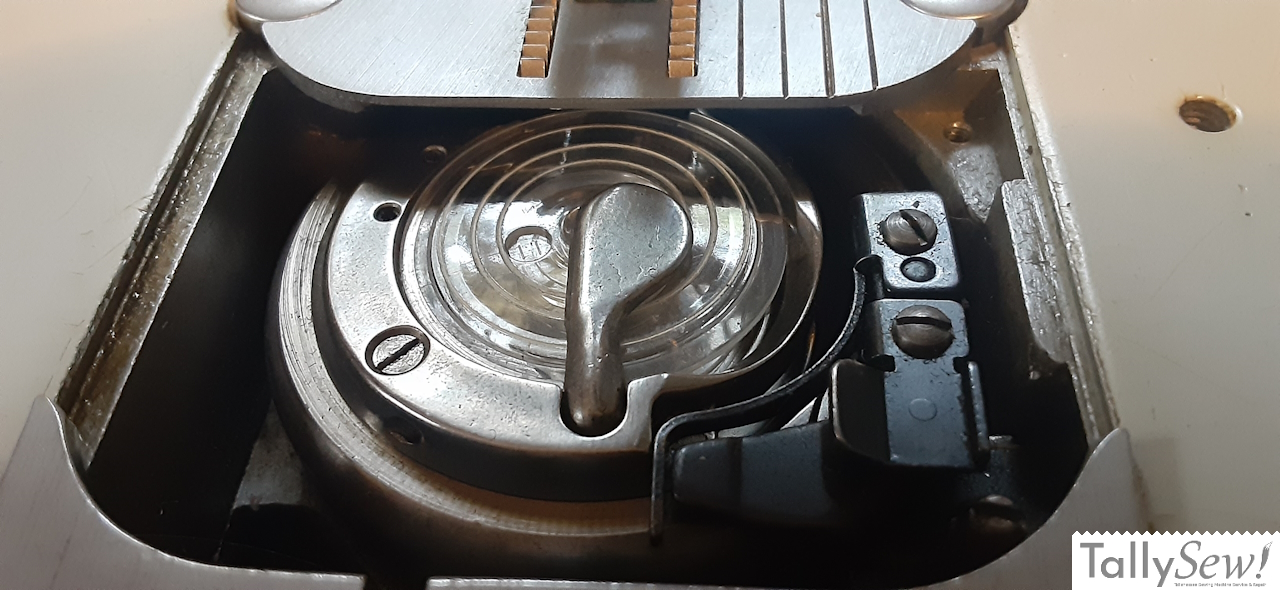 The name “Auto-Reel” refers to the wind in place bobbin, which became a major selling point for the Auto-Reel and later Touch & Sew machines. Notice that the bobbin winder button that showed up in the Touch & Sew machines is missing from the lower left corner of the bobbin area since the bobbin winder button on the Auto-Reel machines is found in front of the main column.