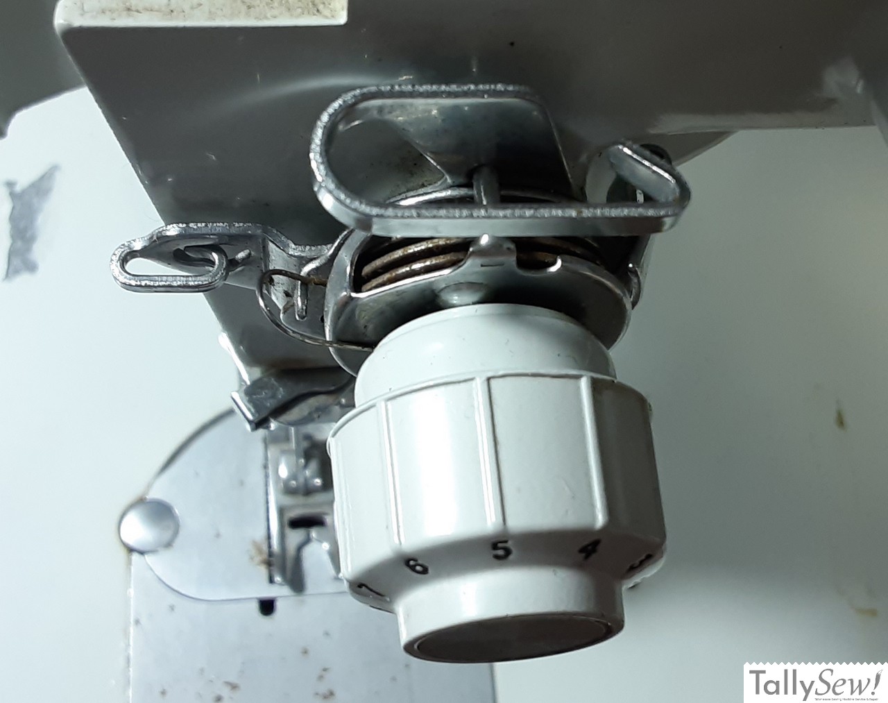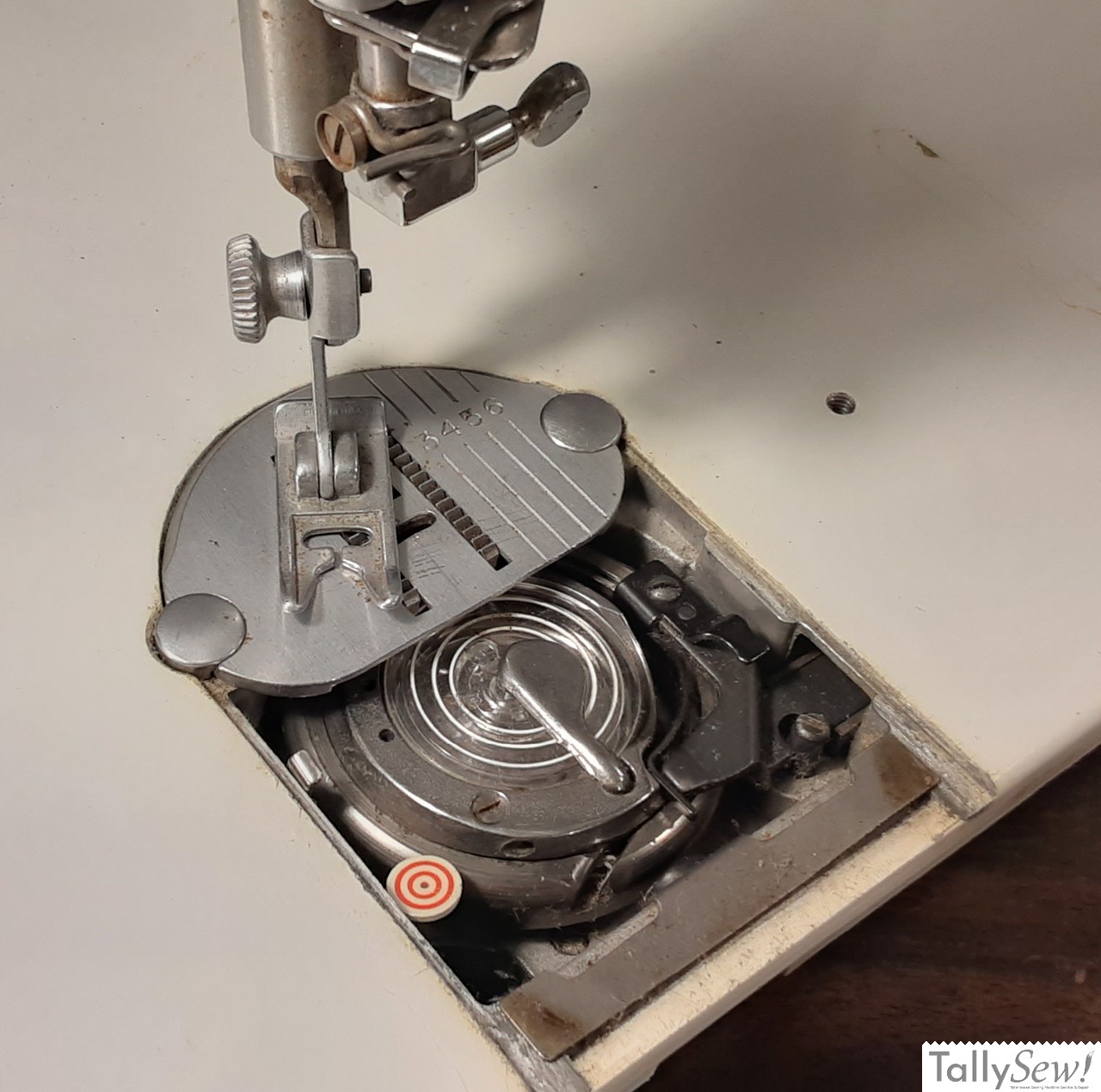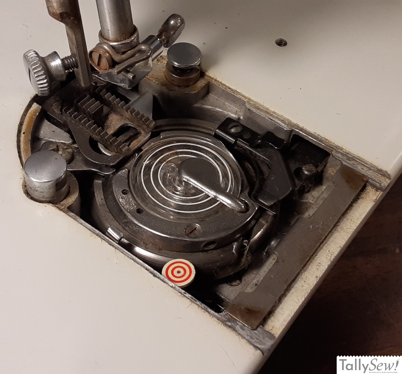 Early style all metal bobbin case, target style bobbin winder button, and Touch & Sew clear bobbin with the white fill indicator lines. Note the presser foot off to the left in the first photo. For some reason the presser foot set screw was missing from this machine, I set it askew intentionally for this photo.