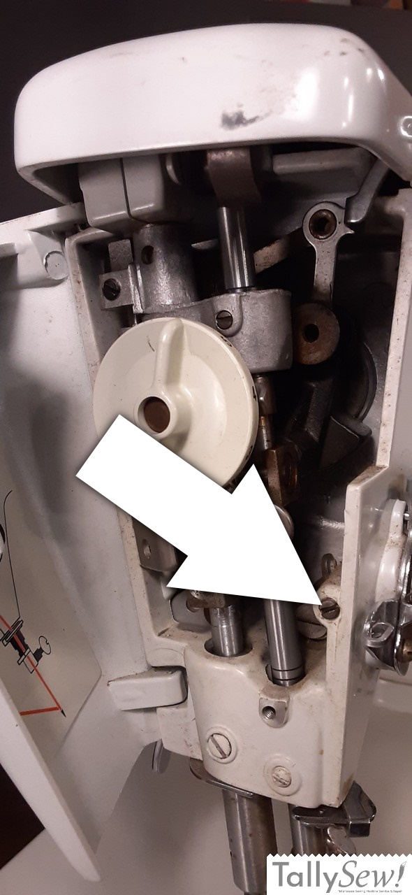 The tensioner unit can be removed by backing out the tensioner unit set screw found behind the needle bar cover. See the photo with the arrow in the gallery above. You can see the whole set screw in the photo above.