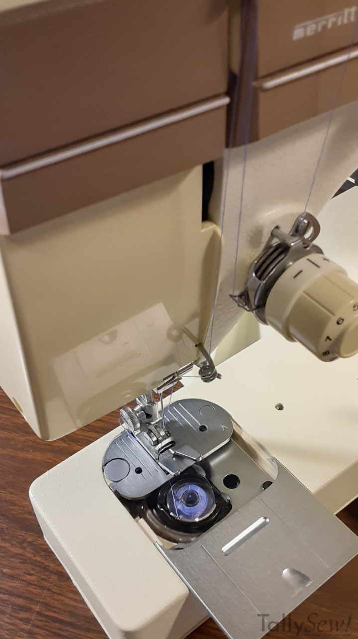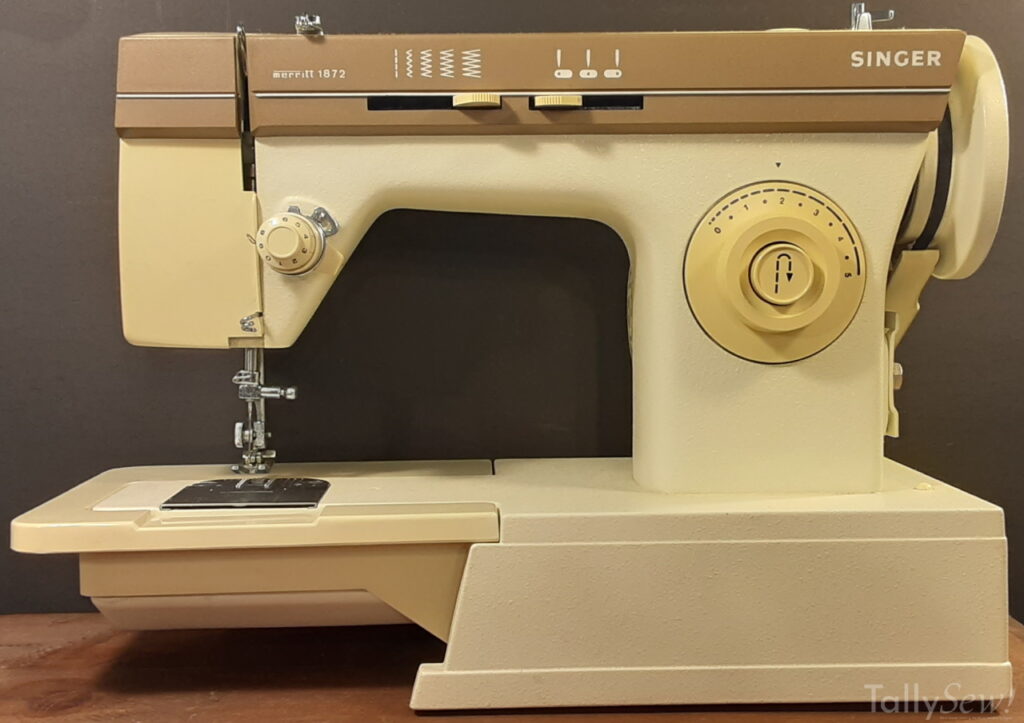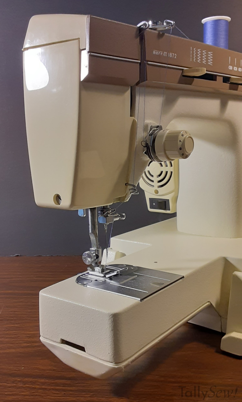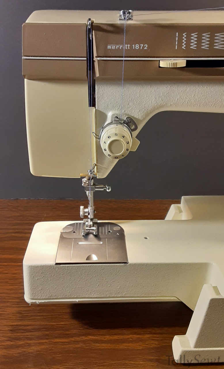The Singer Merritt 1872 uses plastic class 66 bobbins. The bobbin case is plastic, so don’t be tempted to use metal bobbins, they will erode grooves into your bobbin case requiring it’s replacement. The 1872 that I have here came with the standard Zig Zag needle plate, but I have also used a straight stitch plate and presser foot to good effect. I only tried the stitch plate and foot to see if it would work, there isn’t any real practical benefit to straight stitch on this machine since the presser foot tension is not really user adjustable.