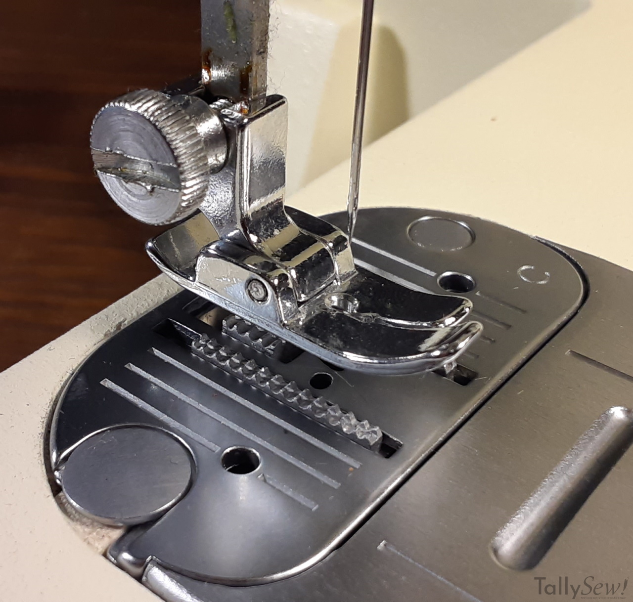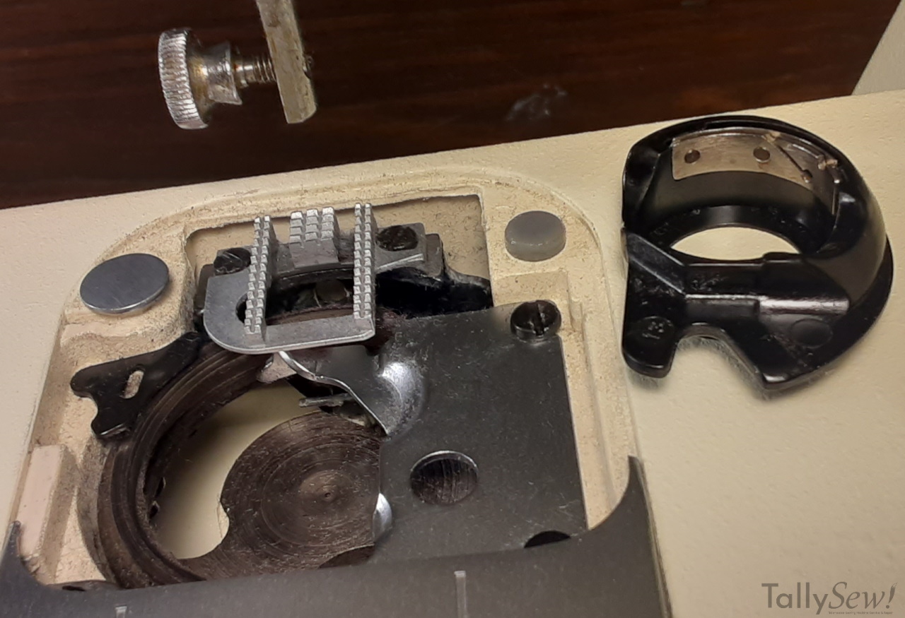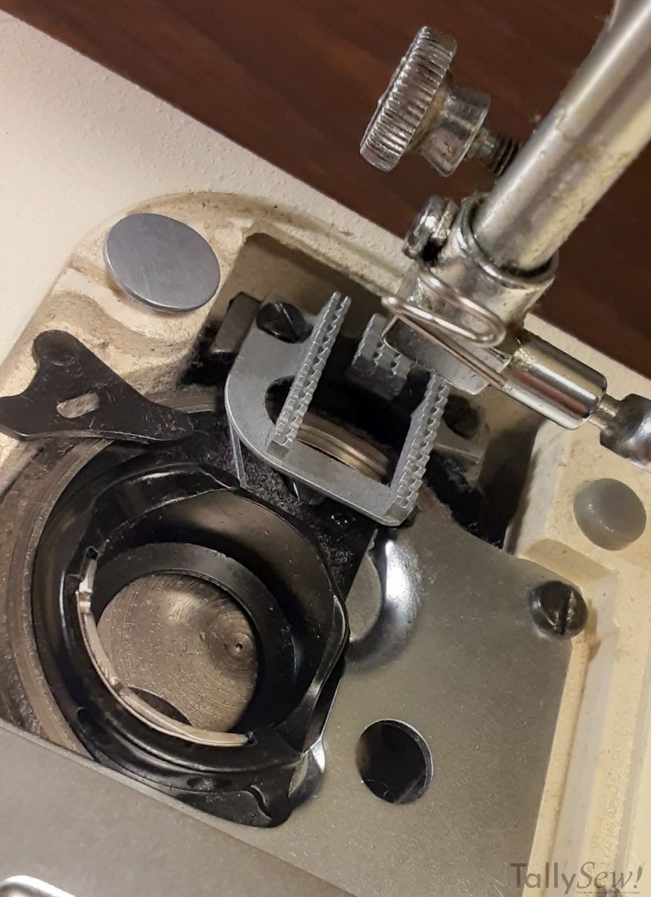 The Singer Merritt 1872 uses plastic class 66 bobbins. The bobbin case is plastic, so don’t be tempted to use metal bobbins, they will erode grooves into your bobbin case requiring it’s replacement. The 1872 that I have here came with the standard Zig Zag needle plate, but I have also used a straight stitch plate and presser foot to good effect. I only tried the stitch plate and foot to see if it would work, there isn’t any real practical benefit to straight stitch on this machine since the presser foot tension is not really user adjustable.