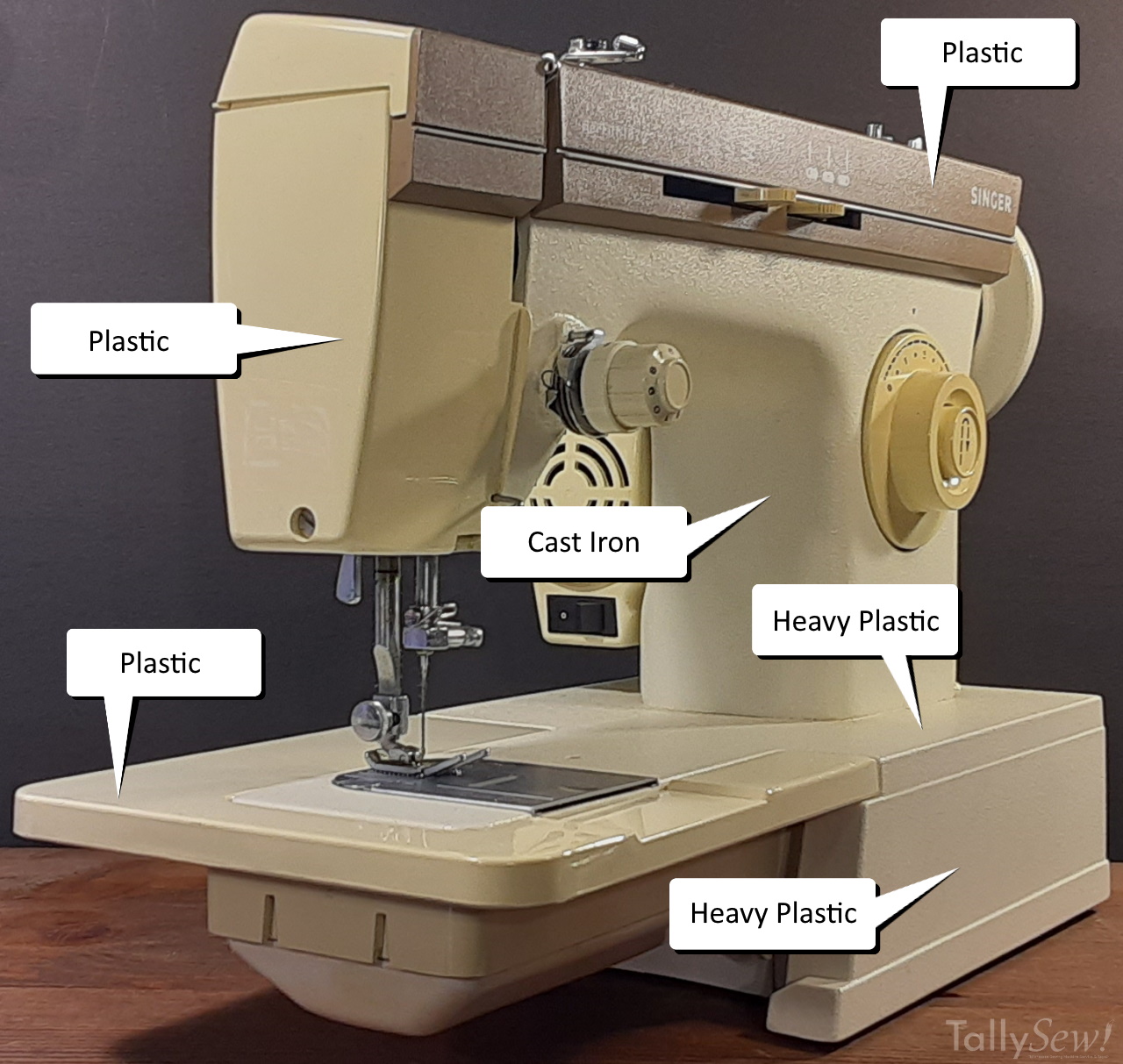 This is one of the later Singer machines to still have a cast iron trunk, and that’s not insignificant. Cast iron adds a lot of weight and structural integrity to the machine. The machine’s deck and base are made of a thick plastic base that’s beefy enough to resist flexing under normal use. The other body parts that are made of lighter plastic are not load bearing parts, and they are as strong as they need to be.